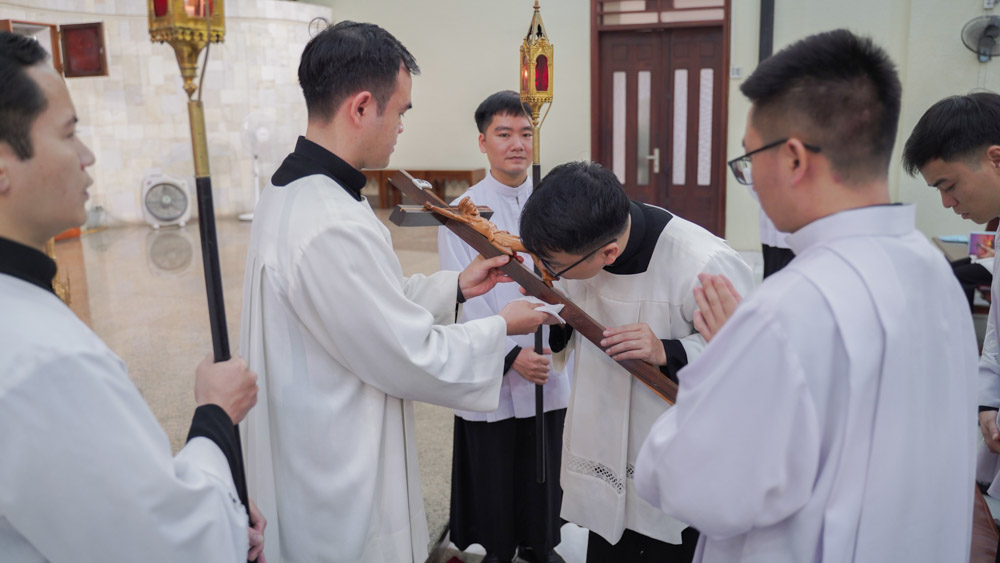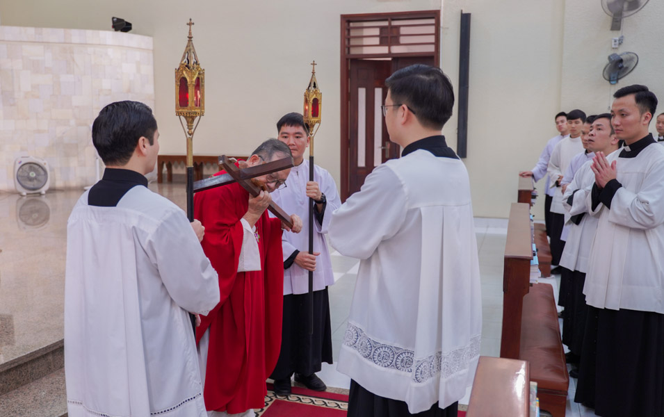 Tiếp nối dòng chảy thiêng liêng đó, tâm tình của cộng đoàn được cô đọng lại nơi nghi thức hôn kính Thánh giá. Qua cử chỉ này, mỗi thành viên trong gia đình Chủng viện cùng bày tỏ sự hiệp thông và tình yêu sâu sắc đối với Đức Giêsu Kitô – Đấng đã hiến mình vì yêu thương nhân loại. Sau khi đã chiêm ngắm và chạm đến mầu nhiệm tình yêu trên Thập giá, cộng đoàn cùng tiến đến bàn tiệc Thánh Thể trong phần Rước lễ, để đón nhận nguồn lương thực thiêng liêng từ chính Đức Kitô chịu đóng đinh.