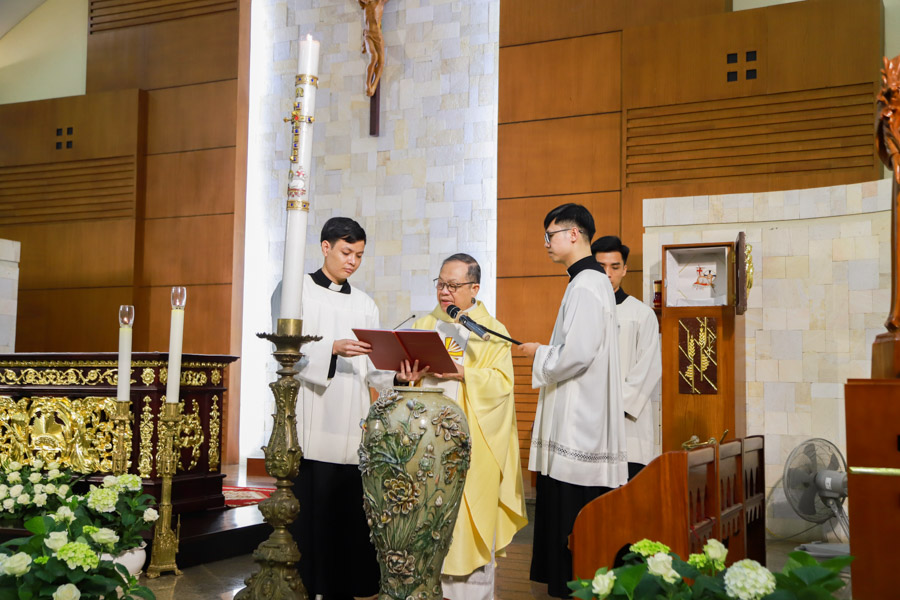 Trong sự tĩnh lặng của ngôi nhà nguyện, cuộc lữ hành đức tin của cộng đoàn bắt đầu bằng Nghi thức Thắp nến Phục Sinh. Ngọn lửa mới được thánh hóa đã xua tan bóng đêm, lan tỏa ánh sáng của Đức Kitô đến từng thành viên trong gia đình Chủng viện. Giữa bầu khí linh thiêng ấy, bài công bố Tin Mừng Phục Sinh (Exsultet) vang lên như một khúc ca khải hoàn, loan báo chiến thắng vinh hiển của sự sống vượt trên sự chết.
