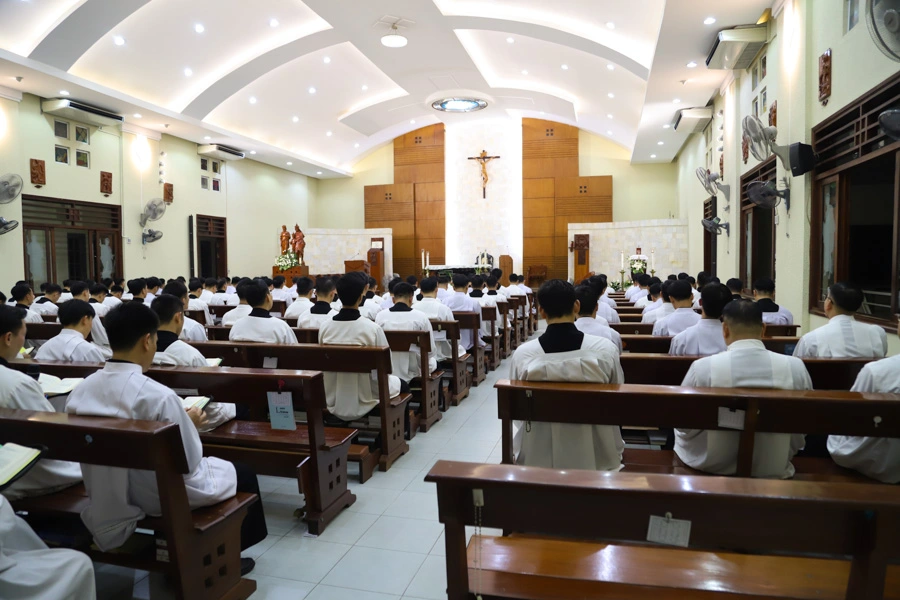 Chiều thứ Bảy, ngày 22/11/2025, gia đình Đại Chủng Viện Thánh Giuse Hà Nội tại Phân khoa Thần học bước vào ngày thứ ba và cũng là ngày khép lại Tam Nhật mừng kính Các Thánh Tử Đạo Việt Nam trong bầu khí trang nghiêm và sốt sắng. Đúng 18g00, toàn thể quý thầy quy tụ nơi Nhà Nguyện Chính để cử hành giờ Kinh Chiều.