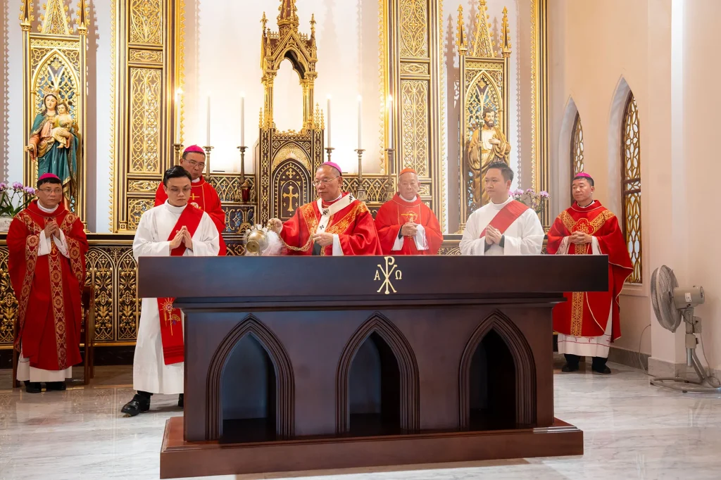 Ngay sau lời nguyện tín hữu, Đức TGM Giu-se đọc lời nguyện thánh hiến và xông hương làm phép bàn thờ mới. Bên bàn tiệc Thánh Thể, cộng đoàn phụng vụ kết hợp với Hy tế tạ ơn của Đức Ki-tô và cầu xin ơn đức tin, sự bình an và tinh thần hiệp nhất.