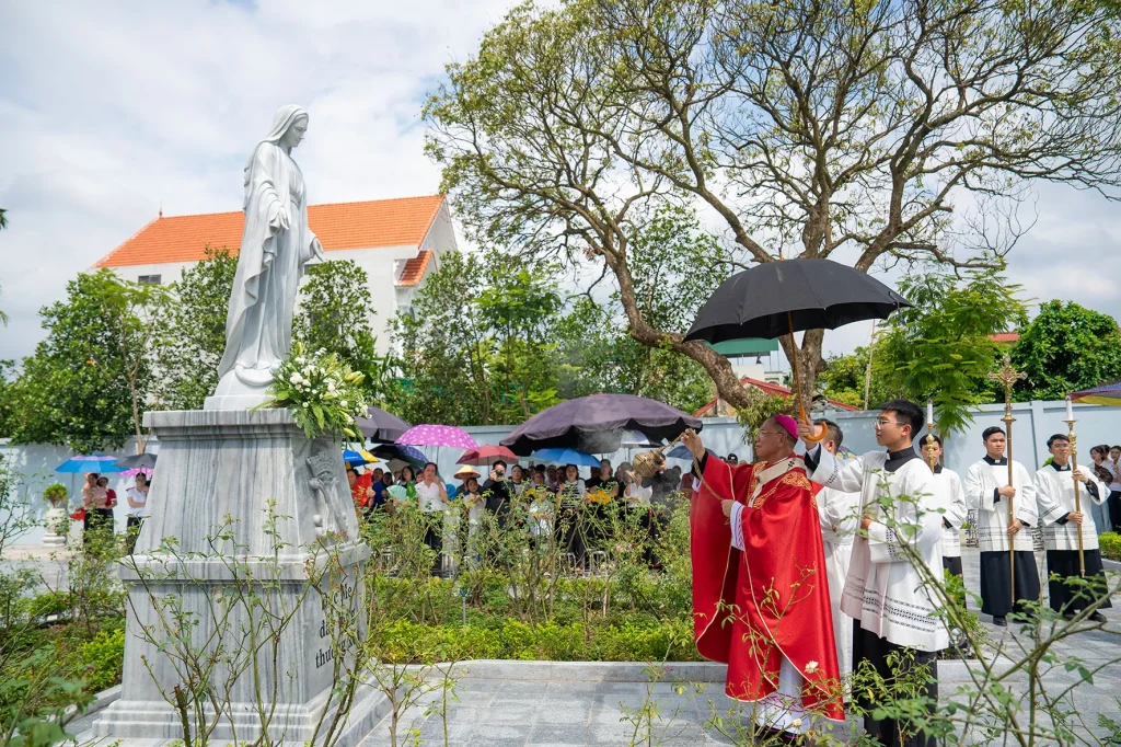 Tiếp đến, Đức TGM Giu-se tiến ra khuôn viên Nhà nguyện cổ để cử hành nghi thức làm phép tượng đài Đức Mẹ. Trong bầu khí trang nghiêm, ngài đọc lời nguyện xin Thiên Chúa chúc lành cho công trình mới được hoàn thành, để mọi người khi chiêm ngắm tượng Đức Mẹ luôn được khích lệ noi gương Mẹ trong đức tin, đức cậy và đức mến.