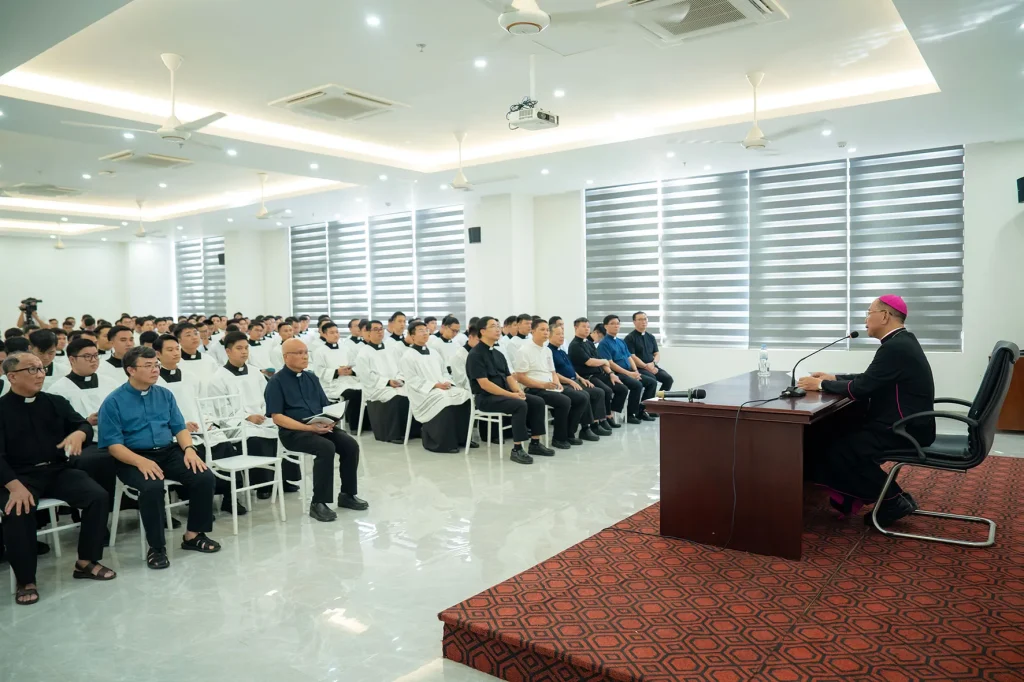 Trong giờ gặp gỡ, Đức TGM Giu-se chia sẻ xoay quanh chủ đề năm học: “Với đức tin và với một lương tâm ngay thẳng” (1 Tm 1,19). Ngài nhấn mạnh: Đức tin và lương tâm ngay thẳng là hai yếu tố không thể tách rời trong đời sống và sứ vụ của linh mục, nhất là trong thời đại xã hội hiện đại, cũng như công nghệ phát triển nhanh chóng. Ngài gợi lại khóa thường huấn dành cho các linh mục miền Bắc về chủ đề “Công nghệ hiện đại và đạo đức truyền thông”, như một minh chứng cho việc cần biết cập nhật kiến thức và áp dụng công nghệ trong mục vụ, nhưng đồng thời phải đào sâu đời sống thiêng liêng để có khả năng phân định.